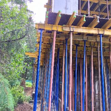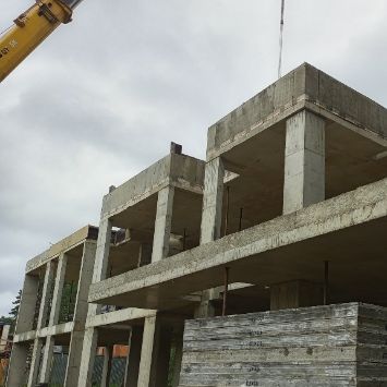Ранее мы завершили работы по раскреплению опалубки и армированию монолитного парапета второго этажа. Следующий этап — бетонирование парапета. Для этого используем бетон марки В25П4. На площадке работает автобетононасос.
