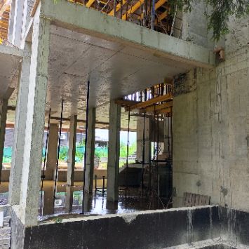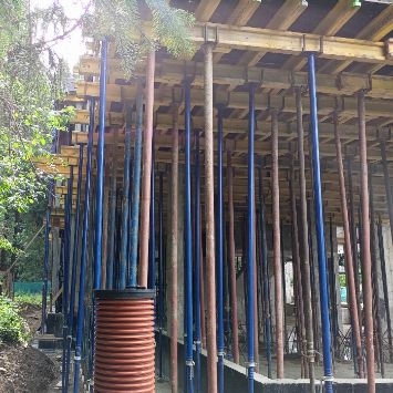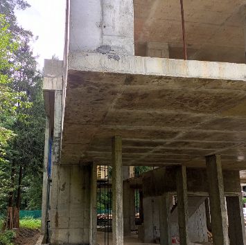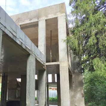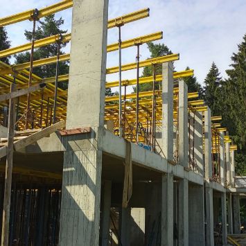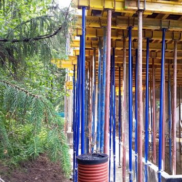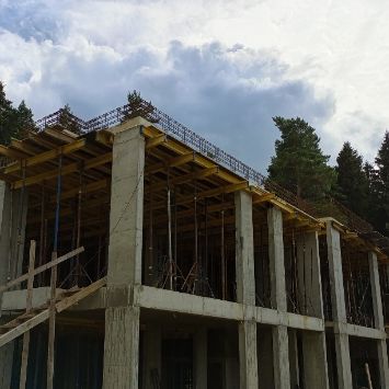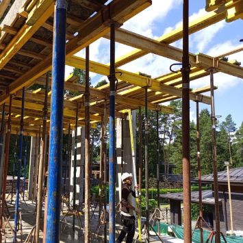 Сейчас рабочие выполняют демонтаж опалубки монолитного перекрытия второго этажа. Ранее они занимались устройством арматурного каркаса и бетонированием плиты перекрытия.