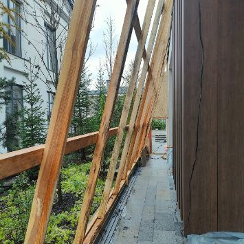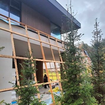 Перед окрашиванием мы загрунтовали поверхность составом Alpina, а для защиты торцевых поверхностей использовали пленкообразующий акриловый состав Remmers Induline SW-910. Это эластичное покрытие, которое эффективно отталкивает влагу и защищает наиболее уязвимые участки от образования плесени и грибка. В качестве финишного покрытия использовали «Аква-лазурь» Alpina в 2 слоя. Она обеспечивает долговременную защиту дерева от влаги, уменьшает поражение грибками и водорослями, сохраняя дышащие свойства древесины.