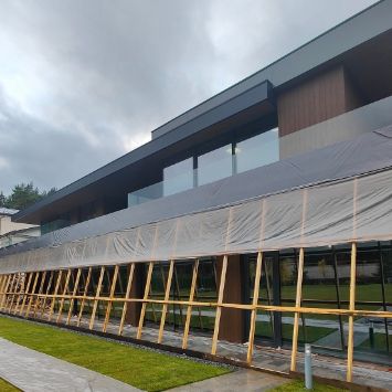 - Основной дом: кладка стен и перегородок, штукатурка ЦПС Perfekta, организация пространства и вывоз мусора, защита пола OSB-плитами, штукатурка оконных откосов