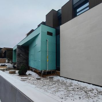 В элитном коттеджном поселке Ренессанс Парк ведется строительство двухэтажной виллы с эксплуатируемой кровлей. Проект разработан для ценителей современного стиля в архитектуре. Благодаря строгим прямым линиям дом гармонично вписывается в загородный ландшафт.