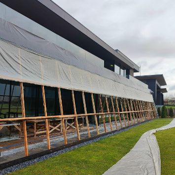 - Собираем временное укрытие – тепляк. Это ключевой момент для качественного ведения строительства в осенне-зимний период! Теперь мы можем работать с деревом и другими материалами в защищенных от влаги и холода условиях, что гарантирует их сохранность и качество монтажа.