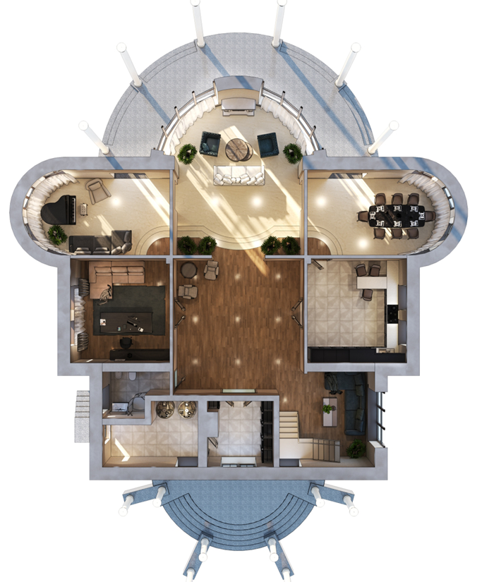 Коттедж «Родос» поражает своим изяществом и торжественностью. Оригинальное архитектурно-планировочное решение проекта в стиле ар-деко сочетает в себе изысканные архитектурные формы с комфортом и эргономичной функциональностью. Плавные линии фасада и огромные панорамные окна придают проекту величественность и особое очарование. Современные мозаичные элементы фасада дома дополняют гармоничный внешний облик этого проекта в современном стиле.