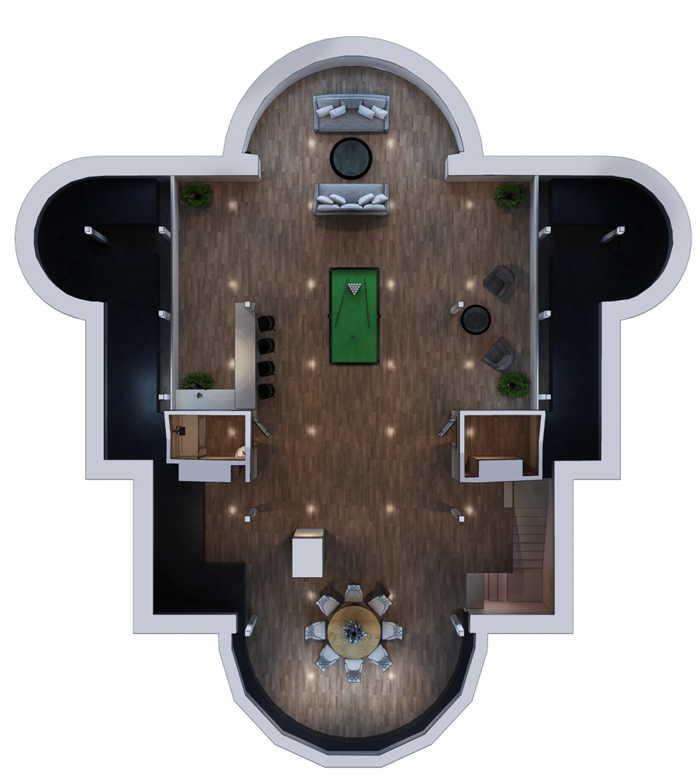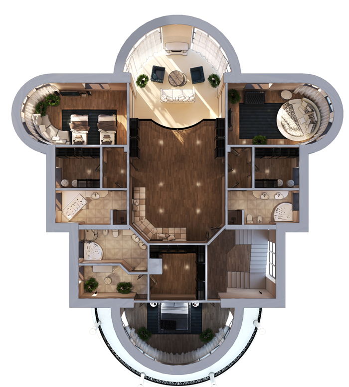 При создании коттеджа «Родос» архитекторы учли потребности всех членов семьи. На втором уровне расположены 3 спальни, каждая из которых имеет собственный выход в холл, санузел и небольшую гардеробную. Главная особенность дома «Родос» — просторная каминная со вторым светом и большими окнами. Двусторонний камин дома в стиле ар-деко позволяет любоваться видом огня как внутри помещения, так и на крытой террасе, которая окружена изящными колоннами.