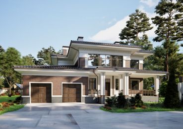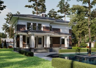 Двухэтажный особняк по проекту «Санторини» — достойный пример классического стиля в архитектуре. Правильно выстроенные пропорции фасада, многоуровневая крыша, вертикальные колонны на входе — все это придает внешнему виду коттеджа строгости и лаконичности.
