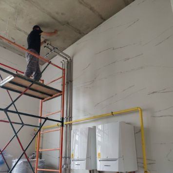 В основе виллы ленточный фундамент, стены толщиной 380 мм — из кирпича М125 с базальтовым минераловатным утеплителем 100 мм, перекрытия — монолитные железобетонные. Фасад облицован крупноформатным керамогранитом Laminam 3,5 мм под натуральный камень. Это практичный и износостойкий материал, который не впитывает влагу и надежно защищает стены от осадков.