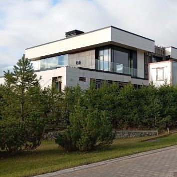 Строгая геометрия фасадов, минималистичный дизайн и эффектное сочетание белого, черного и древесного оттенков делает виллу стильной и актуальной во все времена. А панорамное остекление, террасы, удачное расположение комнат и наличие всех коммуникаций и инженерных сетей делают проживание в коттедже максимально уютным и комфортным.
