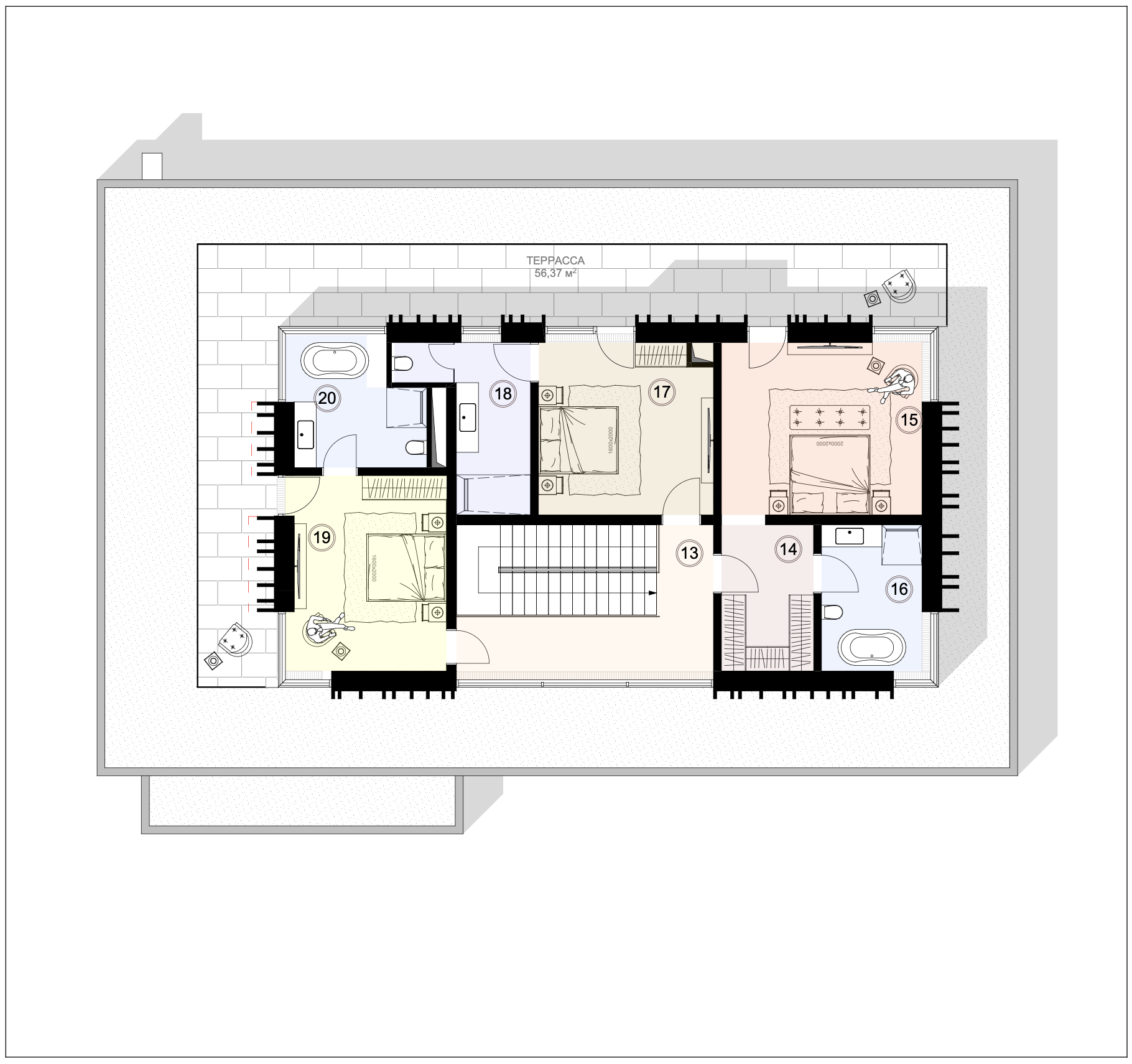 Второй этаж полностью отведен под личные комнаты. Две спальни площадью 19 и 18 кв.м., расположенные в одном крыле, идеально подходят для детских или гостевых комнат. Каждая снащена собственным санузлом. Центральное место занимает роскошная мастер-спальня с просторной ванной комнатой и удобной гардеробной. Открытая терраса приглашает насладиться теплом солнечных лучей. Это уютная зона отдыха на свежем воздухе.