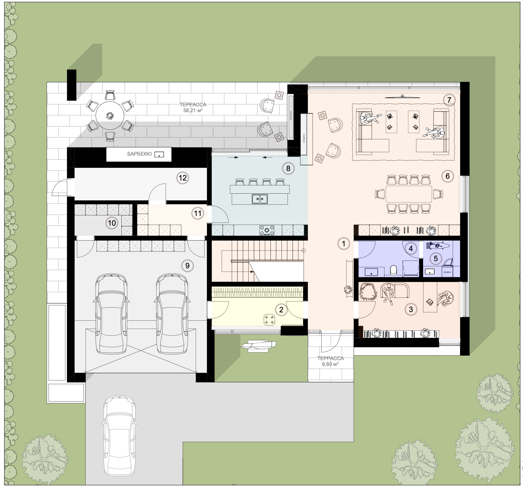 На первом этаже дома Орион объединены общие зоны. Непосредственно у входа расположен кабинет с панорамным окном, выходящем на тихую сторону дома. Просторный холл плавно переходит в обширную зону столовой, гостиной и современной кухни. Для удобства и максимальной функциональности предусмотрены отдельные технические помещения: котельная, вместительная кладовая и практичная постирочная. Они расположенные так, чтобы не нарушать гармонию основных жилых зон.