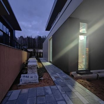 - Начали ландшафтные работы – засыпка почвенным грунтом и устройство газона вдоль клумб, монтаж бетонной брусчатки на песчаное основание.