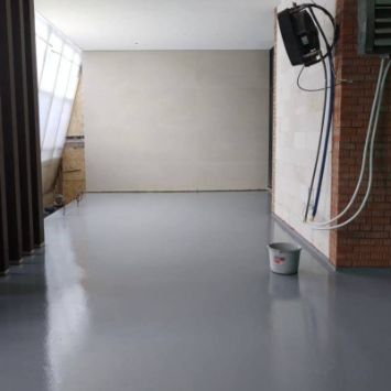 - 1-й шаг – подготовка основания. Стяжку тщательно отшлифовали, обеспылили и заделали в ней штробы. Это гарантирует прочное сцепление материала с основанием.